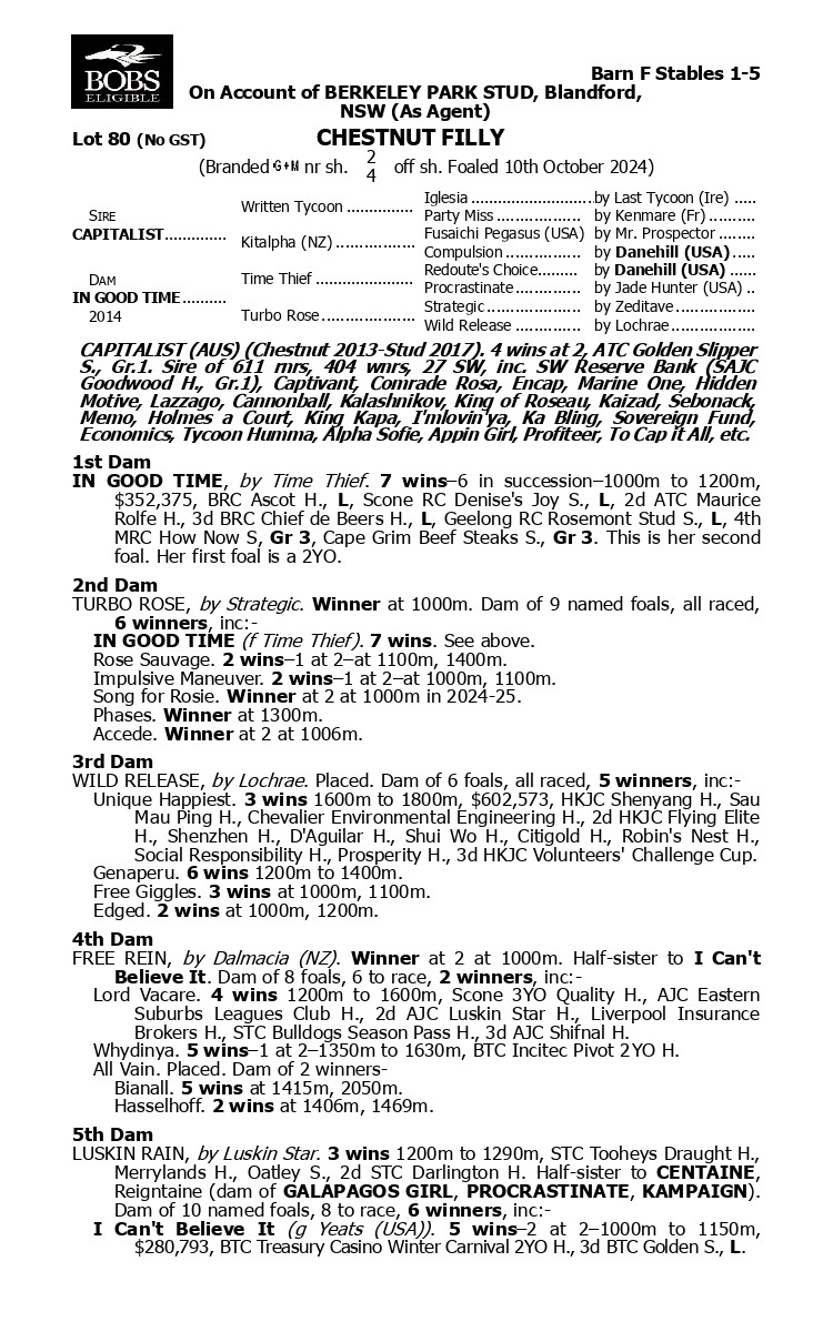 Un-named (Capitalist – In Good Time) 1 Year Old Chestnut Filly ProfilePedigreeEnquire Sire: Capitalist Colour: Chestnut Dam: In Good Time Sex: Filly Age: 1 Foaled: Oct 10, 2024 Country: Australia Trainer: Gai Waterhouse & Adrian Bott Silks: Incentives: https://webcontent.inglis.com.au/sales/30000290/lot_videos/standard/80.mp4 First Name (required) Last Name (required) Your Email (required) Phone Message Hello, I'd like to know more regarding the horse Un-named (Capitalist - In Good Time) you have listed as available. Send Δ