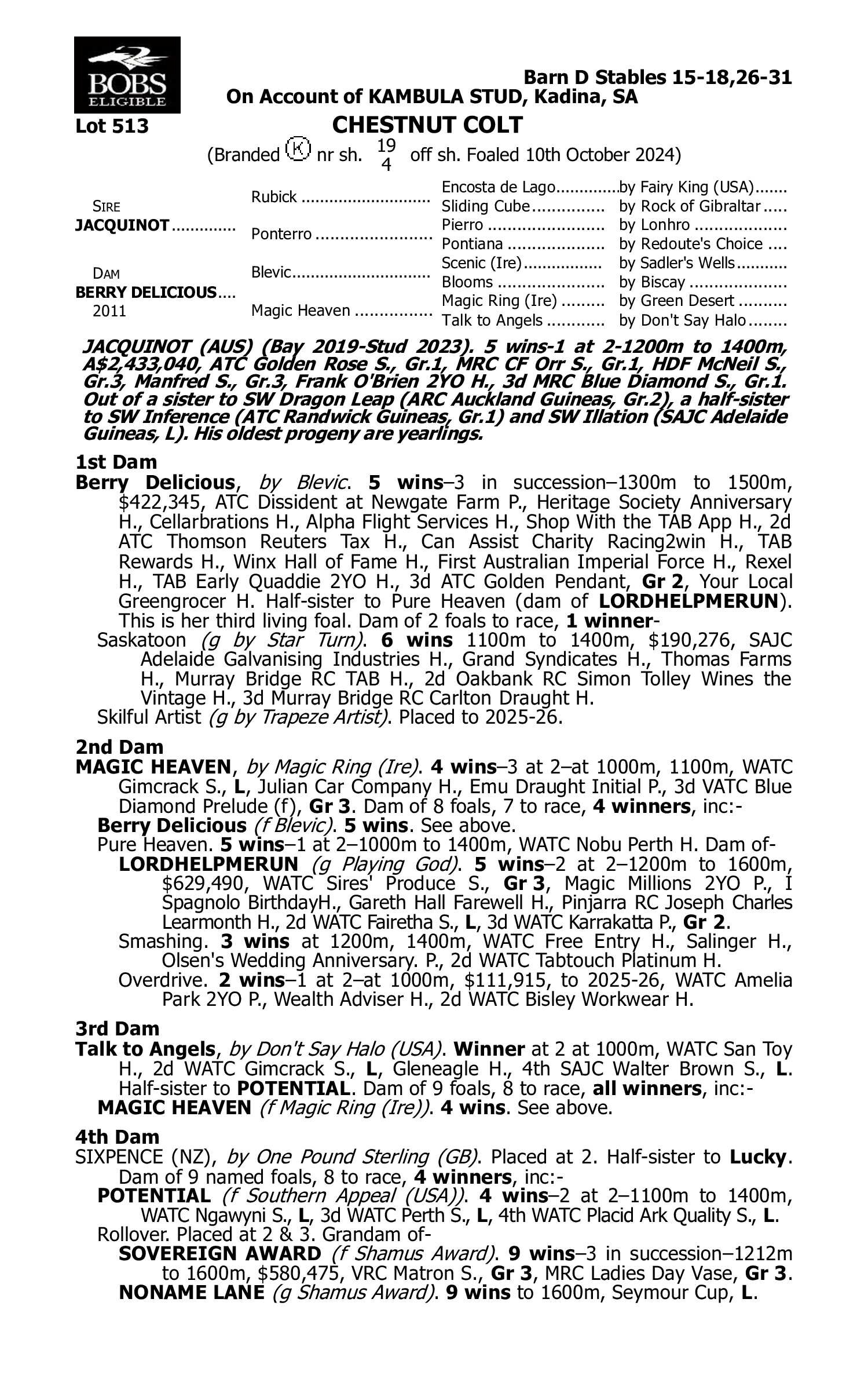 Un-named (Jacquinot – Berry Delicious) 1 Year Old Chestnut Colt ProfilePedigreeEnquire Sire: Jacquinot Colour: Chestnut Dam: Berry Delicious Sex: Colt Age: 1 Foaled: Oct 10, 2024 Country: Australia Silks: Incentives: https://webcontent.inglis.com.au/sales/30000292/lot_videos/standard/513.mp4 First Name (required) Last Name (required) Your Email (required) Phone Message Hello, I'd like to know more regarding the horse Jacquinot x Berry Delicious you have listed as available. Send Δ