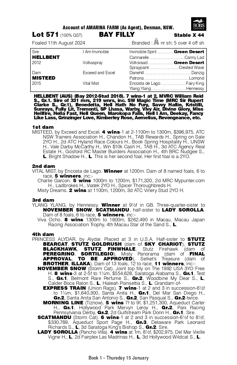 Un-named (Hellbent – Misteed) 1 Year Old Bay Filly ProfilePedigreeEnquire Sire: Hellbent Colour: Bay Dam: Misteed Sex: Filly Age: 1 Foaled: Aug 11, 2024 Country: Australia Trainer: Gai Waterhouse & Adrian Bott Silks: Incentives: First Name (required) Last Name (required) Your Email (required) Phone Message Hello, I'd like to know more regarding the horse Un-named (Hellbent - Misteed) you have listed as available. Send Δ